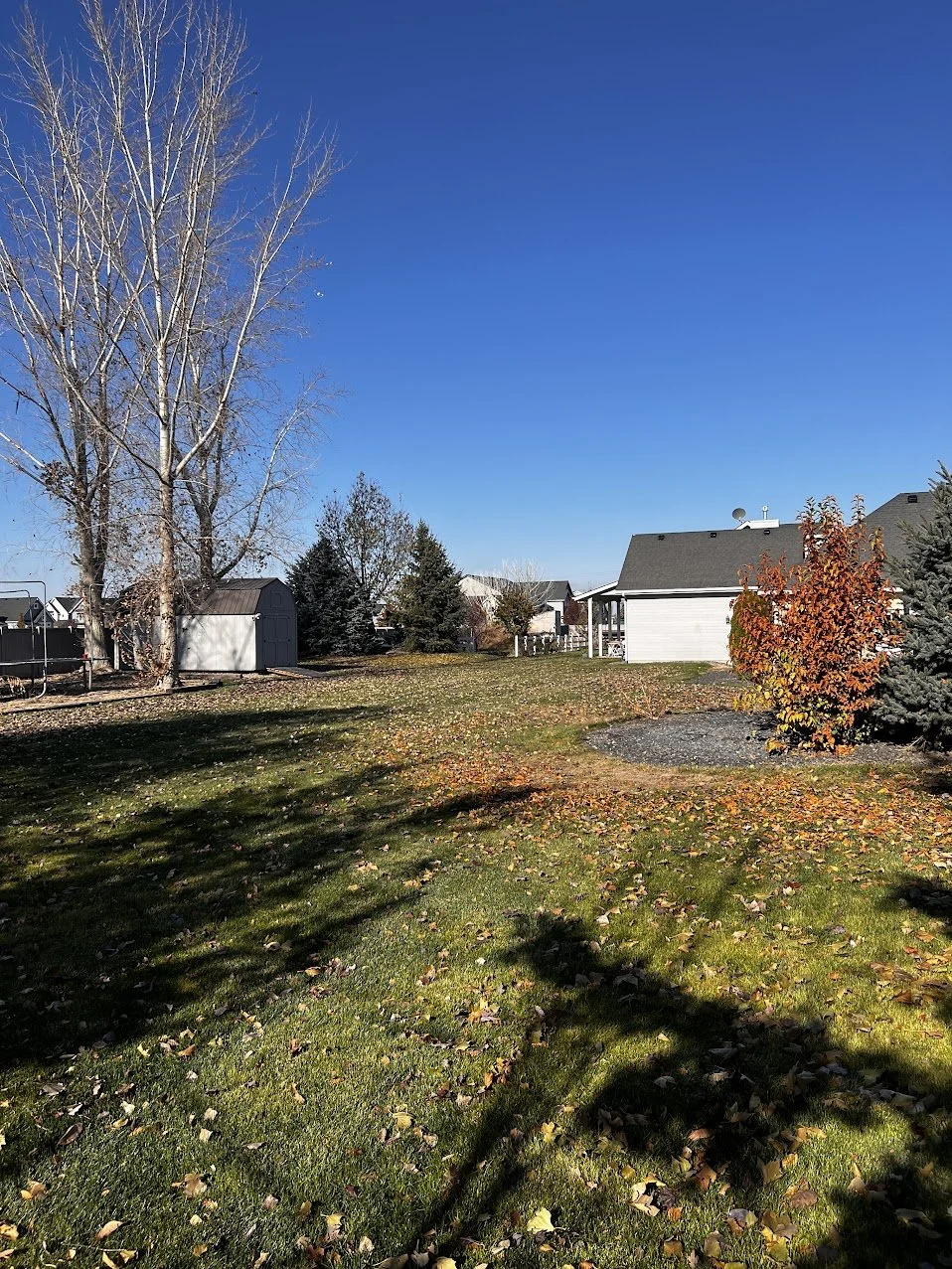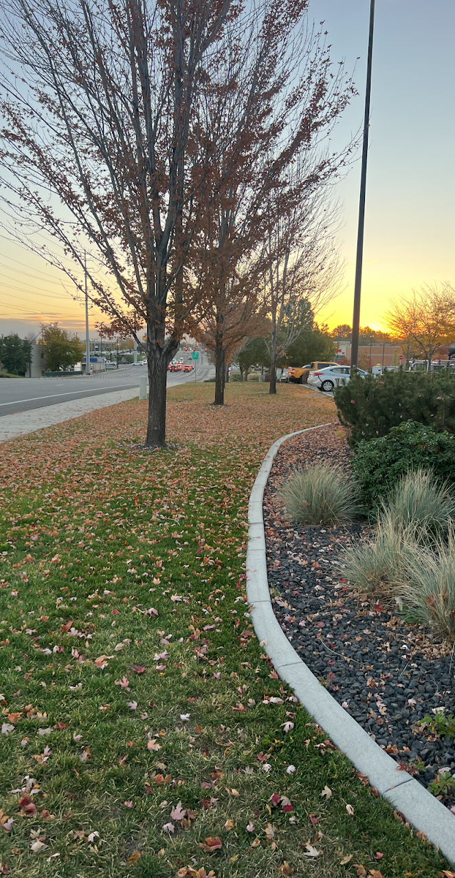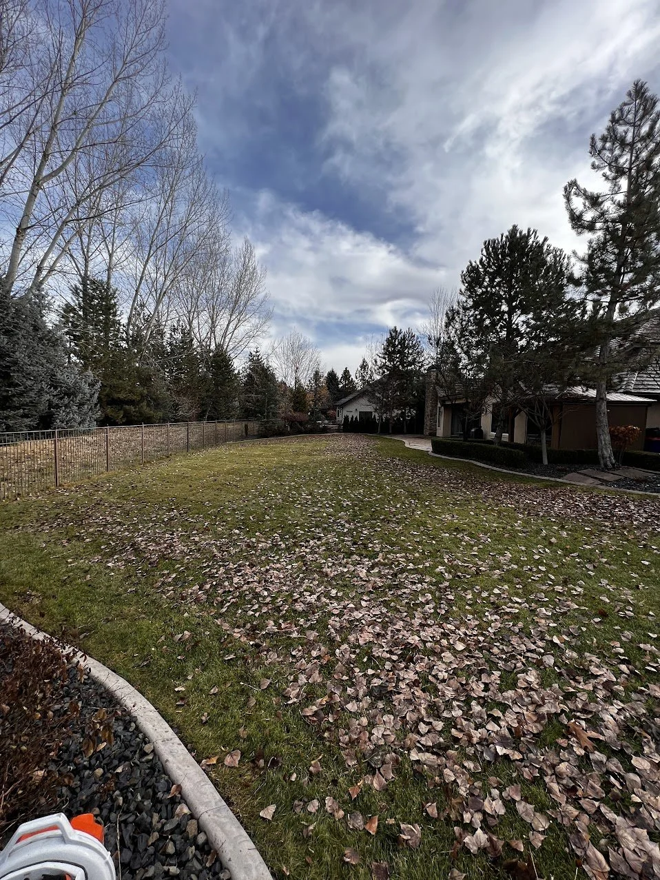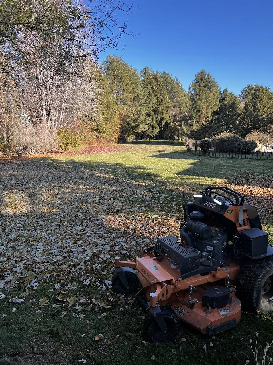 A fall cleanup consists of blowing out flower beds to clean up leaf debris and mowing the lawn to prepare for the winter weather.
